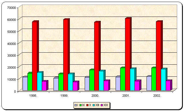 I = Zarazne i parazitarne bolesti; IX = Bolesti cirkulacijskog sustava; X = Bolesti dišnog sustava; XIII = Bolesti mišićno-koštanog sustava i vezivnog tkiva XIX Ozljede i trovanja |