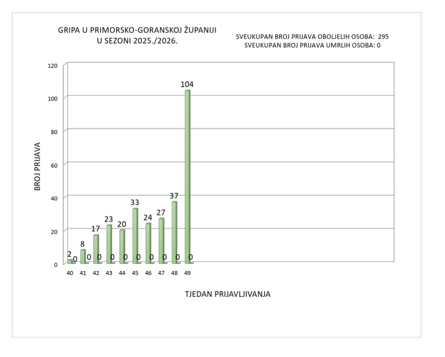 U Primorsko-goranskoj županiji tijekom sezone gripe 2025./2026. zaključno s 8. 12. 2025. godine, na temelju zaprimljenih prijava zaraznih bolesti u Odjelu za epidemiologiju zaraznih i kroničnih nezaraznih bolesti NZZJZ PGŽ zaprimljene su ukupno 295 prijave oboljelih osoba od gripe od čega su 104 prijava zaprimljene u 49. tjednu 2025. godine. Smrtni ishodi povezani s gripom nisu zabilježeni.