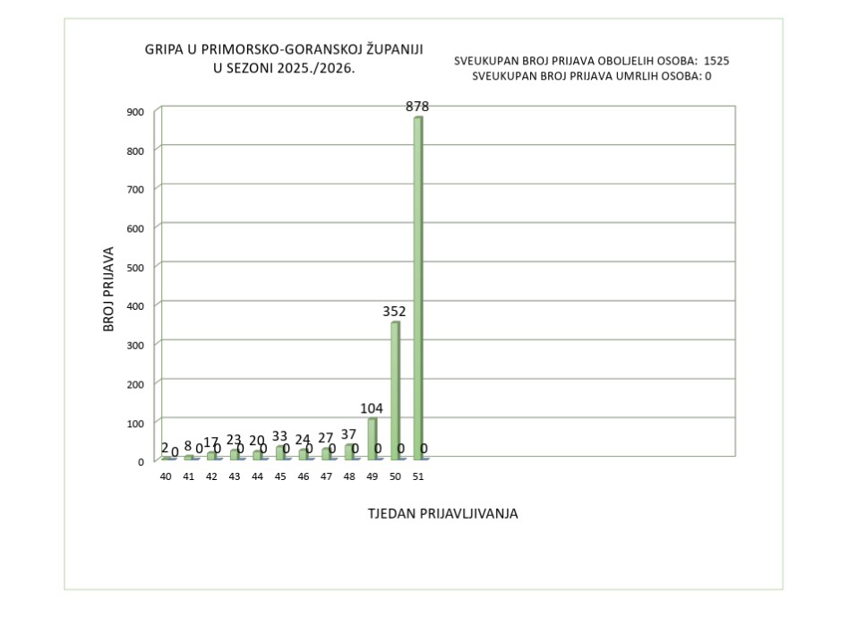 U Primorsko-goranskoj županiji tijekom sezone gripe 2025./2026. zaključno s 22. 12. 2025. godine, na temelju zaprimljenih prijava zaraznih bolesti u Odjelu za epidemiologiju zaraznih i kroničnih nezaraznih bolesti NZZJZ PGŽ zaprimljene su ukupno 1 525 prijava oboljelih osoba od gripe od čega su 878 prijava zaprimljene u 51. tjednu 2025. godine. Smrtni ishodi povezani s gripom nisu zabilježeni.