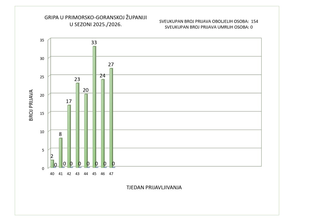 U Primorsko-goranskoj županiji tijekom sezone gripe 2025./2026. zaključno s 24. 11. 2025. godine, na temelju zaprimljenih prijava zaraznih bolesti u Odjelu za epidemiologiju zaraznih i kroničnih nezaraznih bolesti NZZJZ PGŽ zaprimljene su ukupno 154 prijave oboljelih osoba od gripe od čega je 27 prijava zaprimljeno u 47. tjednu 2025. godine. Smrtni ishodi povezani s gripom nisu zabilježeni.