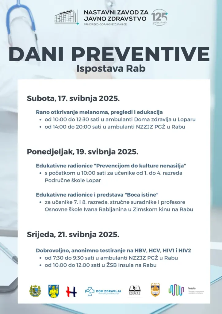 Ispostava Rab Nastavnog zavoda za javno zdravstvo Primorsko-goranske županije i ove godine organizira Dane preventive, koji će se održati od 17. do 21. svibnja 2025. godine. Program obuhvaća niz aktivnosti usmjerenih na rano otkrivanje bolesti, edukaciju djece i mladih te prevenciju nasilja.