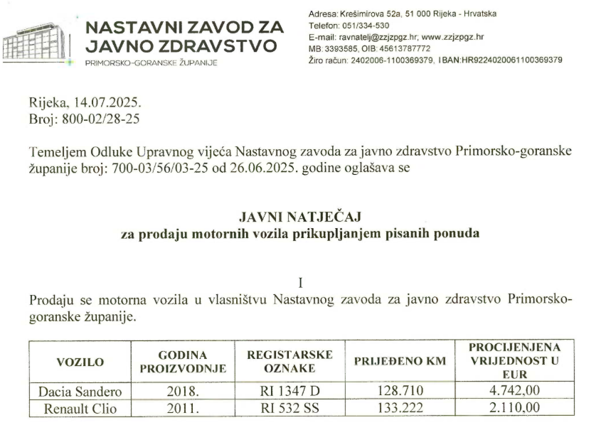 Početna stranica / NOVOSTI / JAVNI NATJEČAJ ZA PRODAJU MOTORNIH VOZILA PRIKUPLJANJEM PISANIH PONUDA