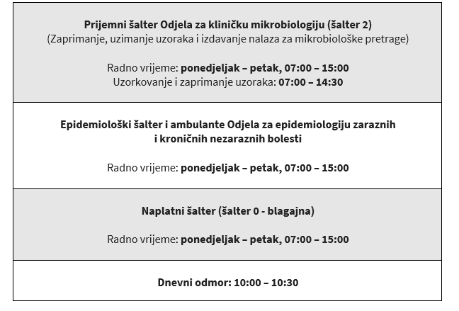 Zbog prilagodbe ljetnom režimu rada, od 14. srpnja 2025. dolazi do izmjena radnog vremena Odjela za kliničku mikrobiologiju i Odjela za epidemiologiju zaraznih i kroničnih nezaraznih bolesti te šaltera za naplatu.