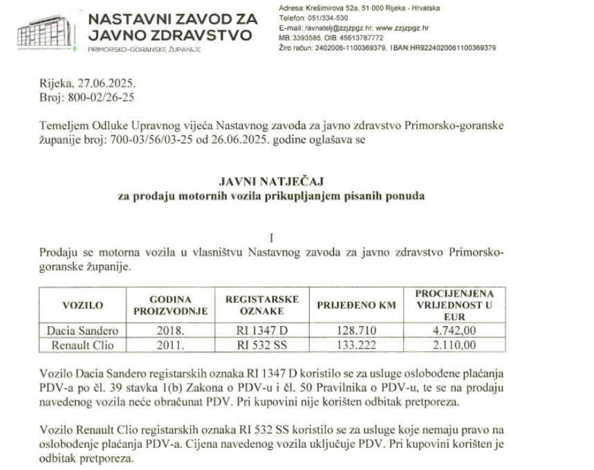 Početna stranica / NOVOSTI / NATJEČAJ ZA PRODAJU VOZILA