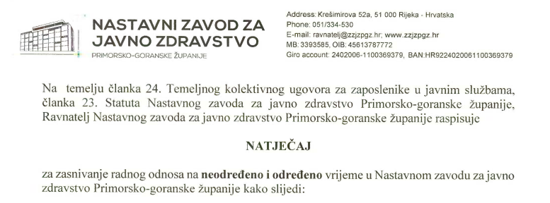 Početna stranica / NOVOSTI / Natječaj za zasnivanje radnog odnosa na neodređeno i određeno vrijeme u Nastavnom zavodu za javno zdravstvo Primorsko-goranske županije