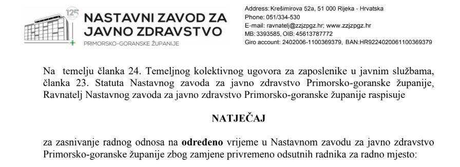 Početna stranica / NOVOSTI / NATJEČAJ ZA ZASNIVANJE RADNOG ODNOSA NA ODREĐENO VRIJEME OD 04.07.2025 – ODLUKA O ODABIRU
