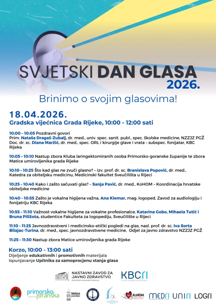 U sklopu događanja, na Korzu će od 10:00 do 13:00 sati biti organizirano i javnozdravstveno informiranje građana uz podjelu edukativnih materijala te mogućnost ispunjavanja upitnika za samoprocjenu stanja glasa.
