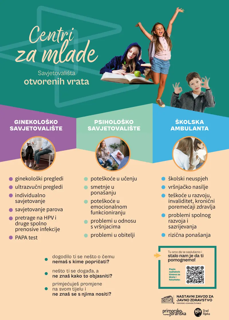 Centri za mlade, Psihološko savjetovalište, Savjetovalište za reproduktivno zdravlje te ginekološka ambulanta dostupni su svim učenicima i studentima besplatno i bez liječničke uputnice na lokalitetu Zamet. Tu priliku, tijekom 20 godina djelovanja, u županiji je iskoristilo gotovo 43.000 mladih, od čega se gotovo 32.000 Centrima obratilo u posljednjih 10 godina.
